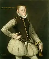 Rudolf spent eight formative years, from age 11 to 19 (1563–1571), in Spain, at the court of his maternal uncle Philip II, together with his younger brother Ernest, future governor of the Low Countries.[2] After his return to Vienna, his father was concerned about Rudolf's aloof and stiff manner, typical of the more conservative Spanish court, rather than the more relaxed and open Austrian court; but his Spanish mother saw in him courtliness and refinement.[3] In the years following his return to Vienna, Rudolf was crowned King of Hungary (1572), King of Bohemia and King of the Romans (1575)[4] when his father was still alive.