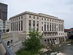 The Rundel Memorial Building is a historic library building located at Rochester in Monroe County, New York. It is the original downtown site of the Rochester Public Library, and along with the Bausch & Lomb Library Building directly across the street, serves as the Central Library of Rochester and Monroe County. It is a framed in reinforced concrete and faced in smooth Indiana limestone. It consists of three main floors, a mezzanine, two underground levels, a catwalk level above the river, and a penthouse area for equipment. It was constructed between 1934 and 1936, and represents an integration of Beaux-Arts planning and massing with Art Deco detailing and stylization. The building is sited along the east side of the Genesee River directly above the Johnson and Seymour millrace and Rochester Subway. The building was built in part with monies from the estate of Morton W. Rundel and with a grant from the Public Works Administration.[2]