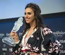 Jamala, who represented Ukraine at the 2016, won with the song "1944". The lyrics for her song concern the deportation of the Crimean Tatars, in the 1940s, by the Soviet Union at the hands of Joseph Stalin because of their alleged collaboration with the Nazis.[5] Jamala explained that the lyrics were inspired by the story of her great-grandmother Nazylkhan, who was in her mid-20s when she and her five children were deported to barren Central Asia. One of the daughters did not survive the journey.[6] Eurovision's official rules state that "no lyrics, speeches, gestures of political or similar nature shall be permitted,"[7] so Jamala repeatedly stated that her song was not referencing the 2014 annexation of Crimea, but her own personal family history. She stated, "I needed that song to free myself, to release the memory of my great-grandmother, the memory of that girl who has no grave." [8] However, at the same time she did reference the current state of Crimea post-annexation, saying "Of course [the song is] about 2014 as well." [9] "Now the Crimean Tatars are on occupied territory and it is very hard for them. They are under tremendous pressure. Some have disappeared without a trace. And that is terrifying. I would not want to see history repeat itself." [10]
