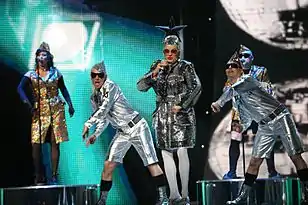 Verka Serduchka was chosen to represent Ukraine at the 2007 Contest with the song "Dancing Lasha Tumbai". However, it was alleged that the song had contained political subtext, including a reference in its lyrics to "Maidan" (the site of the Orange Revolution demonstrations), and that the phrase "Lasha Tumbai" was a mondegreen of "Russia goodbye".[2] Serduchka denied these allegations, claiming that the phrase "lasha tumbai" was Mongolian for "churned butter".[2] On the Russian talk show Пусть говорят, which aired on Channel One Russia just after the final of the contest, a native Mongolian speaker explained that the phrase "Lasha Tumbai" does not exist in the Mongolian language.[3] Serduchka later stated that "Lasha Tumbai" was a meaningless phrase meant to rhyme with other lyrics.[4]