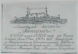 Gangut was built by the Admiralty Works in Saint Petersburg. Her keel was laid down on 16 June 1909 and she was launched on 22 September 1911. At the end of October 1914, she collided with her sister Poltava which delayed her trials, scheduled for 9 November 1914, to late December 1914.[5] She entered service on 11 January 1915 when she reached Helsingfors and was assigned to the First Battleship Brigade of the Baltic Fleet. Gangut and her sister Sevastopol provided distant cover for minelaying operations south of Liepāja on 27 August, the furthest that any Russian dreadnought ventured out of the Gulf of Finland during World War I. She ran aground on 10 September, but suffered only minor damage. A minor mutiny broke out on 1 November when the executive officer refused to feed the crew the traditional meal of meat and macaroni after coaling.[6] The return of the captain and the issue of a dinner of tinned meat restored order on the ship. On 10–11 November and 6 December Gangut and her sister Petropavlovsk again provided distant cover for minelaying operations. She saw no action of any kind during 1916. Her crew joined the general mutiny of the Baltic Fleet on 16 March 1917, after the idle sailors received word of the February Revolution in Saint Petersburg. The Treaty of Brest-Litovsk required the Soviets to evacuate their base at Helsinki in March 1918 or have them interned by newly independent Finland even though the Gulf of Finland was still frozen over. Gangut and her sisters led the first group of ships on 12 March and reached Kronstadt five days later in what became known as the 'Ice Voyage'.[7]