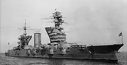 Gangut was laid up on 9 November 1918 for lack of manpower and was renamed Oktyabrskaya Revolutsiya on 27 June 1925 while she was being refitted. She was recommissioned on 23 March 1926 and began a partial reconstruction on 12 October 1931,[8] incorporating the lessons from the earlier modernizations of her sisters Marat and Parizhskaya Kommuna. The tubular tower-mast of Marat was replaced by a larger and sturdier structure with a KDP-6 fire control director, equipped with two 6-meter (20 ft) Zeiss rangefinders positioned on top. The aft superstructure was enlarged and a new structure was built just forward of it, with another KDP-6 director surmounting it, which required the repositioning of the mainmast 9 meters (30 ft) forward. This did not leave enough room for a derrick, as was used on Marat, so two large boat cranes were mounted on each side of the mainmast. Her funnel was curved to the rear rather than angled like Marat. Each turret received Italian 8-meter (26 ft) rangefinders and their roof armor was increased to 152-millimeter (6.0 in) in thickness. A new forecastle, much like that of Marat, was fitted to improve seakeeping. Six 76.2-millimeter (3.00 in) 34-K anti-aircraft (AA) guns were added, three on the roofs of the fore and aft turrets. All twenty-five of her old boilers were replaced by a dozen oil-fired boilers originally intended for the Borodino-class battlecruiser Izmail. The space saved was used to add another inboard longitudinal watertight bulkhead that greatly improved her underwater protection.[9] Her original Pollen Argo Clock mechanical fire-control computer was upgraded with a copy of a Vickers Ltd fire-control computer, designated AKUR by the Soviets, as well as a copy of a Sperry stable vertical gyroscope.[10] These changes increased her displacement to 26,690 tonnes (26,270 long tons; 29,420 short tons) at full load and her overall length to 184.9 meters (607 ft). Her metacentric height decreased to 1.67 meters (5 ft 6 in) from her designed 1.76 meters (5 ft 9 in) as a result of her enlarged superstructures.[11]