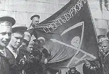 Petropavlovsk was the only operable dreadnought belonging to the Soviets and provided cover to smaller ships on raiding missions. On 31 May 1919 she fired in support of the Russian destroyer Azard and several minesweepers that had taken the bait laid by the British forces supporting the White Russians. The British destroyer HMS Walker appeared to be operating alone and the Soviets sortied to attack her, but a number of other British destroyers were positioned to sweep in behind the Soviets. Azard retreated at full speed and Petropavlovsk opened fire on Walker at about 14,000 yards (12,802 m). She hit Walker twice, inflicting only minor damage and wounding two sailors, and the British destroyers eventually disengaged when they got too close to Soviet coastal artillery and minefields.[6] A few days later Petropavlovsk and the pre-dreadnought battleship Andrei Pervozvanny bombarded Fort Krasnaya Gorka whose garrison had mutinied against the Bolsheviks. She fired no fewer than 568 12-inch shells[7] and the garrison surrendered on 17 June when Leon Trotsky promised them their lives, only to subsequently order them machine-gunned.[8] On 17 August 1919 Petropavlovsk was claimed as torpedoed and put out of action by the British Coastal Motor Boat CMB 88 during a night attack in Kronstadt harbor, but was, in fact, not damaged at all.[9] The crew of Petropavlovsk joined the Kronstadt Rebellion of March 1921. After it was bloodily crushed she was renamed Marat to honor the French revolutionary leader Jean-Paul Marat on 31 March 1921.[10] By 1922 her primary rangefinder had been moved to a platform on the foremast and she mounted three 3-inch "Lender" AA guns each on the roofs of the fore and aft turrets.[11]
