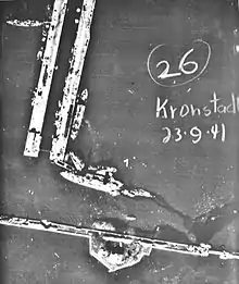 She was sunk at her moorings on 23 September 1941 by two near-simultaneous hits by 1,000-kilogram (2,200 lb) bombs near the forward superstructure. They caused the explosion of the forward magazine which heaved the turret up, blew the superstructure and forward funnel over to starboard and demolished the forward part of the hull from frames 20 to 57. 326 men were killed and the ship gradually settled to the bottom in 11 meters (36 ft) of water.[17] Her sinking is commonly credited to the Stuka pilot Oberleutnant Hans-Ulrich Rudel of III./StG 2, but Rudel dropped only one of the two bombs.[18] The rear part of the ship was later refloated and she was used as a floating battery although all of her 120 mm guns were removed. Initially only the two rearmost turrets were operable, but the second turret was repaired by the autumn of 1942. She fired a total of 1,971 twelve-inch shells during the Siege of Leningrad.[17] In December 1941 granite slabs 40–60 millimeters (1.6–2.4 in) thick from the nearby harbor walls were laid on her decks to reinforce her deck protection. Another transverse bulkhead was built behind frame 57 and the space between them was filled with concrete to prevent her sinking if the original bulkhead was ruptured.[19]