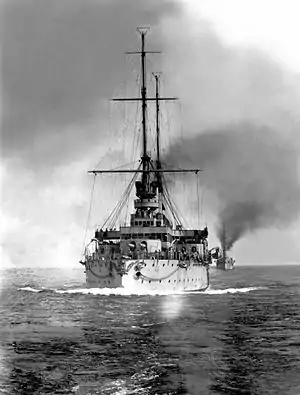 Rostislav was a pre-dreadnought battleship built by the Nikolaev Admiralty Shipyard in the 1890s for the Black Sea Fleet of the Imperial Russian Navy. She was conceived as a small, inexpensive coastal defence ship, but the Navy abandoned the concept in favor of a compact, seagoing battleship with a displacement of 8,880 long tons (9,020 t). Poor design and construction practices increased her actual displacement by more than 1,600 long tons (1,600 t). Rostislav became the world's first capital ship to burn fuel oil, rather than coal.[2] Her combat ability was compromised by the use of 10-inch (254 mm) main guns instead of the de facto Russian standard of 12 inches (305 mm).