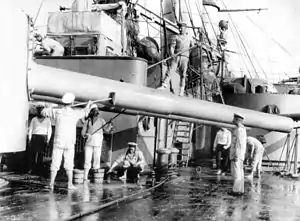 Two plans for modernizing the ship were put forward before World War I. In 1907 the Naval General Staff proposed a major reconstruction aimed at reducing her draft and raising her armor belt higher out of the water. Her above-water torpedo tubes, torpedo nets, auxiliary boilers and 47-millimeter guns would have been removed, her superstructure cut down and her rigging reduced to a single pole mast. These changes would have reduced her displacement by 250 long tons (250 t), but the plan was rejected due to a shortage of money.[32] Her above-water torpedo tubes, however, were removed about this time.[33] In 1912 the staff of the Black Sea Fleet proposed to replace all of her 47 mm guns with four 75-millimetre (3 in) guns and to remove the auxiliary boilers and the submerged torpedo tubes to offset the additional weight. The Naval General Staff did not think that this was worth the cost and rejected the plan.[32] Even though these plans did not come to fruition, other alterations were made to Rostislav before the war. A dozen of her 37 mm guns were removed in 1906, and she was fitted with 15-foot (4.6 m) rangefinders, probably made by Barr and Stroud, in 1907 and 1908.[33]