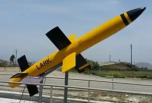 The Lark project was a high-priority, solid-fuel boosted, liquid-fueled rocket surface-to-air missile developed by the United States Navy to meet the kamikaze threat.[2] After Lark configuration was established by the Bureau of Aeronautics in January 1945 Fairchild Aircraft was given a contract to produce 100 missiles in March 1945. Fairchild used radio command guidance with a semi-active radar homing AN/DPN-7. A backup contract for another 100 missiles was given to Convair in June 1945. Convair used beam riding guidance with AN/APN-23 active radar homing.[3] Neither version was successful. Six of the Convair airframes were given to Raytheon to explore use of velocity-gated continuous wave doppler radar for guided missile target seekers, while most other United States investigators used range-gated pulse radar. One of these Raytheon guidance systems in a Convair airframe scored the first successful United States surface-to-air missile interception of a flying target in January 1950.[2]