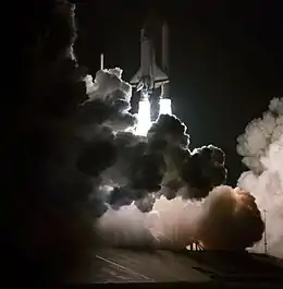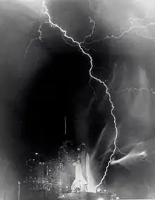 The launch, which occurred in pre-dawn darkness, was the first American night launch since Apollo 17,[33] and was watched by several thousand spectators. The unusual launching time was due to tracking requirements for the primary payload, INSAT-1B;[1] the program would not have another night launch until STS-61-B in 1985.[34] The crew had attempted to prepare for it by training in darkened simulators so as to keep their night vision, but in practice it was discovered that the light of the solid-fuel rocket boosters made the immediate area around the launchpad virtually as bright as a day launch.[35]
