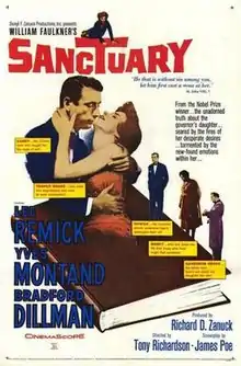 Sanctuary is a 1961 drama film directed by Tony Richardson. The film, based on the William Faulkner novels Sanctuary (1931) and Requiem for a Nun (1961), is about the black maid of a white woman who kills the latter's newborn in order to give her employer a way out of a predicament, and then faces the death penalty.[2]