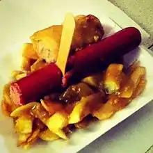 A saveloy served with chips and curry sauce in Nottingham, England