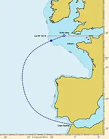 Shovell's fleet of twenty-one ships left Gibraltar on 29 September, with HMS Association serving as his own flagship, HMS Royal Anne as flagship of Vice-Admiral of the Blue Sir George Byng and HMS Torbay as flagship of Rear-Admiral of the Blue Sir John Norris.[5] The passage was marked by extremely bad weather and constant squalls and westerly gales. As the fleet sailed out on the Atlantic, passing the Bay of Biscay on their way to England, the weather worsened, and on most days it was impossible to take the observations needed to determine their latitude. On 21 October they came into the soundings, with depths of 93–130 fathoms (about 170–240 metres), indicating that they were coming onto the edge of the continental shelf.[6] At noon that day the weather cleared and good readings of latitude were obtained, at 48° 50–57' N. Taken together these observations suggested a location about 200 miles west-southwest of Scilly.[7][8] This was the last observation of latitude, and the rest of the voyage relied on dead reckoning.
