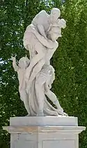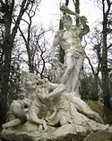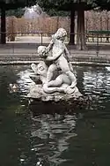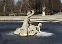 Appearing at the base of the grotto are four tritons—creatures who are half-man and half-fish—who are part of the sea-god's entourage. Each holds a conch shell trumpet with which they can inspire fear. They are restraining the sea-horses who draw Neptune's chariot across the seas.[40] This image of Neptune commanding the watery dominion was a common symbol in sixteenth, seventeenth, and eighteenth-century art, to represent monarchs controlling the fate of their people.[40] In the nineteenth century, a bank of evergreen trees was planted behind the white figural group to provide a dark contrast.[40]