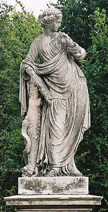| 13 | Hygieia | Joseph Baptist Hagenauer | Hygieia was the goddess of health and cleanliness.[21] She was the daughter of Asclepius, the god of healing,[21] and Epione, the goddess of soothing of pain. Hygieia had five sisters who also represented aspects of Apollo's healing: Panacea the goddess of universal remedy, Iaso the goddess of recuperation, Aceso the goddess of the healing process, and Aglaea the goddess of beauty.[22] | ![]() Hygieia |