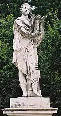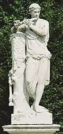 | 31 | Amphion | Joseph Baptist Hagenauer | Amphion was the son of Zeus by Antiope.[37] After she was raped by Zeus, Antiope fled to Sicyon and married King Epopeus. She was later captured by Nycteus or Lycus and taken back to Thebes. Along the way she gave birth to the twins and was forced to leave them on Mount Cithaeron. After being enslaved by Lycus and his wife Dirce, who treated her cruelly for many years, Antiope escaped and eventually found her sons, who avenged her captivity by killing Dirce—tying her to the horns of a bull.[38] Amphion and Zethus went on to conquer Thebes, where they ruled together. Amphion became a great singer and musician after Hermes taught him to play and gave him a golden lyre. He and his brother built the walls around the Cadmea, the citadel of Thebes. Amphion's musical skill was so great that when played his lyre, the stones simply moved into place.[38] | ![]() Amphion |