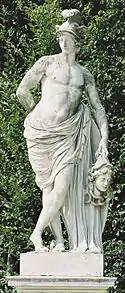 | 18 | Mercury | Ignaz Platzer | Mercury was the god of eloquent speech and was often shown wearing a winged hat and shoes, and carrying a caduceus or herald's staff with two entwined snakes.[29] The son of Maia and Jupiter, the god of trade and the primary god of the Roman state religion, Mercury gave his name to the element "mercury" because of his apparent swiftness and speed.[29] He was also thought of as a mediator between human and divine wisdom.[29] | ![]() Mercury |
