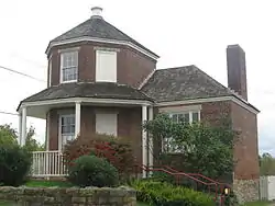 The Searights Tollhouse is located about 5 miles (8.0 km) northwest of Uniontown, and stands on the west side of US 40 north of its junction with Dearth Road. It is a brick building whose most prominent feature is a two-story octagonal tower about 20 feet (6.1 m) tall, capped by an octagonal roof and small octagonal cap. A single-story porch extends around about three-quarters of the tower, and there are two single-story single-room wings extending to the north and west. The building was designed so that the tollkeeper had good views of the road in both directions, and was originally fitted with a swinging gate that would block the road.[4]