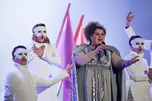 The stage show featured Bojana in a silver dress with two female and two male backing vocalists dressed in long white coats and donning white masks. The staging for the song, directed by Gorčin Stojanović, began with white elements and lighting and the backing vocalists walking in the background holding coloured flags. As the song progressed, the stage displayed flashing blue and pink lights while the backing vocalists took their coats and masks off and danced. In regards to the staging, composer Vladimir Graić commented: "In the beginning, she feels heartbroken, but at some point she decided to set herself free. Masks are falling down and she is shining again".[36][37] The four backing vocalists that joined Bojana on stage were Saška Janković, Sanja Bogosavljević, Oliver Katić and Marko Nikolić.[39]