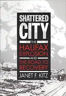 Shattered City: The Halifax Explosion and the Road to Recovery is a 1989 Canadian non-fiction book by Janet Kitz describing the experience of the Halifax Explosion with an emphasis on the experience of ordinary people and families who became victims or survivors of the 1917 munitions explosion in Halifax, Nova Scotia. The book broke new ground, making extensive use of oral history interviews conducted by Janet Kitz to tell previously unknown stories from the event, illustrated by documents and photographs collected by the author as well as images and artifacts from the Maritime Museum of the Atlantic. The first book published in many years about the explosion, it broke the record for the largest number of books ever sold at a book launch in Nova Scotia[1] and has been credited as creating a renaissance in published accounts about the 1917 disaster.[2] The book has been reprinted several times and has remained a definitive account of the disaster which has influenced numerous works that have followed.[3][4] Janet Kitz went on to write two follow-up books: Survivors: Children of the Halifax Explosion (2000) which explored in more detail the stories of children who survived and December 1917: Revisiting the Halifax Explosion (2006) with Joan Payzant which looked at the impact of the explosion on the landscape of Halifax and Dartmouth.