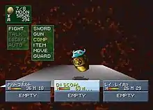 Enemies are confronted on the overworld map and in dungeons through both random encounters and staged battles. Battles are governed by a turn-based system: the player's and enemy's parties each get a turn during which they can perform available actions. The player party is arranged in a three-by-two grid, with their positioning effecting how they can attack enemies: for instance, short-ranged attacks are made less effective if the selected party member is in the back row. The player has access to multiple commands in battle: "Sword", "Gun", "Magic" and "Extra". Items can also be used in battle, and the player can choose to escape from most encounters aside from key boss battles. An "Auto" option is also available, where the entire party is commanded using the game's artificial intelligence. At the end of each successful battle, experience points are distributed among party members depending on the strength of the enemy, and the protagonist is given Ability Points to assign to six different attributes which affect his performance in battle.[1][2]