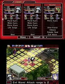 In combat situations, the player takes turns with the computer opponents to defeat enemies and satisfy certain mission objects such as helping innocent characters to escape the field safely, while avoiding conditions that will end the mission in failure. Both the player and computer control a number of squads composed of one leader and two supporting characters. In each turn, a squad can move and attack an enemy, and its individual members can perform one additional action such as healing the squad, buffing their attack, disabling an opposing squad, or for human characters, summoning a new demon to replace an unconscious one. When attacking an enemy, the game allows the player to select one action for each squad member, and the computer doing the same for its squad. Certain actions in combat can gain a specific squad member the ability to perform one additional combat round action after combat resolution, such as striking at an opponent's weakness. While any three members of the opposing squad can be targeted by combat actions, the leader remains strong while either of the two supporting units still retain health. However, if the leader is taken down to zero health, the entire squad becomes disabled even if the two supporting units remain healthy. For the player, they can earn more experience by first removing the supporting squad members before attacking the leader, but can also extend the length of battle and present more of a risk for surviving it. Defeating individual foes in battle gains experience points for the player and their units, and "macca", a form of currency used for the game. Completing a battle can earn additional experience and macca for all of the player's units, and completely revives any fallen units.[5]