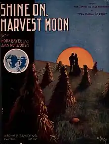 "Shine On, Harvest Moon" is a popular early-1900s song credited to the married vaudeville team Nora Bayes and Jack Norworth. It was one of a series of moon-related Tin Pan Alley songs of the era. The song was debuted by Bayes and Norworth in the Ziegfeld Follies of 1908 to great acclaim. It became a pop standard, and continues to be performed and recorded in the 21st century.