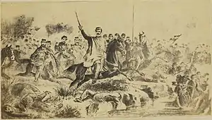 Lieutenant Colonel Gaspar Campos, chief of Battalion "Cazadores de la Rioja", surprised at Acayuazú, saves the flag of his battalion, throwing it into the river.