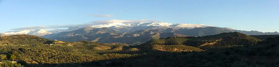 Sierra Nevada (Spanish: [ˈsjera neˈβaða]; meaning "mountain range covered in snow") is a mountain range in the region of Andalucia, in the province of Granada and, a little further, Málaga and Almería in Spain. It contains the highest point of continental Spain:[note 1] Mulhacén, at 3,479 metres (11,414 ft) above sea level.