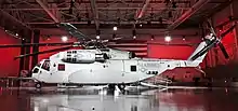 The CH-53 was the product of the US Marine Corps' "Heavy Helicopter Experimental" (HH(X)) competition begun in 1962. Sikorsky's S-65 was selected over Boeing Vertol's modified CH-47 Chinook version. The prototype YCH-53A first flew on 14 October 1964.[1] The helicopter was designated "CH-53A Sea Stallion" and delivery of production helicopters began in 1966.[2] The CH-53A was equipped with two T64-GE-6 turboshaft engines, and had a maximum gross weight of 46,000 lb (20,865 kg).