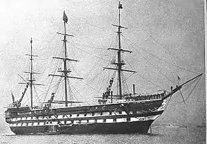 He became Commander-in-Chief, Mediterranean, hoisting his flag in the battleship HMS Lord Warden, in April 1869.[5] He was promoted to full admiral on 1 April 1870[11] and advanced to Knight Grand Cross of the Order of the Bath on 20 May 1871.[12] "In the autumn of 1870 the Mediterranean Squadron, under the command of Sir Alexander Milne joined up with the Channel Squadron for the purpose of carrying out combined manoeuvres off the coast of Portugal, and Sir Alexander, being the senior admiral, took supreme command. The low freeboard, fully rigged turret-ship Captain had joined the Channel Squadron a short time before, and the combined fleet put to see from Vigo".[13] On 6 September "the fleet was sailing in two columns on the starboard tack in a fresh north-west breeze, and Sir Alexander Milne went on board the Captain in the afternoon to inspect her and see how she behaved at sea, as she was a novelty... During the time the Commander-in-Chief was on board the Captain the wind and sea had increased, and he had great difficulty in getting back to his own ship – the Lord Warden. In fact, the captain of the Captain (Hugh Burgoyne) tried to persuade him not to risk it, but to remain on board for the night and return in the morning. Sir Alexander, however, was a dour auld Scotsman and said he would get back to his ship, and did."[13] That night the Captain capsized and sank and "only the gunner and seventeen men were saved."[13]