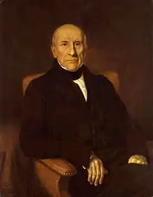 Thomas Gladstones was aware of the limitations of Leith, especially compared with the opportunities then opening up in Glasgow and in Liverpool. In 1784, he sent John to the German Baltic ports to buy grain, transacting his business through an interpreter. In 1786, he travelled to Liverpool, Manchester and London to sell his father's corn and sulphuric acid.[4] But the following year, with his father's financial support, John Gladstones was determined to move to Liverpool. Once he had settled in Liverpool, Gladstones dropped the final "s" from his surname (although this was not formally changed by royal licence until 1835).[5][6] Almost immediately he went into partnership with grain merchants Edgar Corrie and Jackson Bradshaw. The business of Corrie, Gladstone & Bradshaw, and the wealth of its members, soon grew very large.[7] John Gladstone spent a year in the United States, travelling to New York, Pennsylvania, Virginia and Maryland to purchase wheat, maize, flax-seed, hemp, tobacco, timber, leather, turpentine and tar.[8]