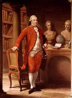 Sir Thomas Gascoigne was born at the English Benedictine convent at Cambrai, the third son of Sir Edward Gascoigne, 6th Baronet of Parlington Hall, Yorkshire, and his wife, Mary (1711–1764), daughter and heiress of Sir Francis Hungate of Saxton, Yorkshire.[2] The Gascoigne family were a staunch Catholic family and Sir Thomas was raised, and remained, a Catholic until his apostasy for a political preferment and a seat in Parliament in June 1780.[3] He succeeded his elder brother, Sir Edward Gascoigne, 7th Bart., who died of smallpox in Paris in January 1762.[4] He was educated alongside postulants at the English Benedictine school at St Gregory's Priory, Douai, and in 1762, as a result of concerns about his indolence and lack of application, was transferred with a private tutor to study philosophy at the Collège des Quatre Nations, Paris. Briefly visiting England and his estates for the first time in late 1763, Gascoigne returned to the Continent in January 1764 to attend the Academy at Turin, with a new tutor Harry Fermor, which marked in essence the beginning of his first continental Grand Tour - a tour that was designed to introduce him to both elite British and Italian society. At Turin, Gascoigne made the acquaintance of the King of Sardinia Charles Emmanuel III, the British charge d'affaires Louis Dutens, the distinguished English Catholic natural philosopher John Turberville Needham, and the historian Edward Gibbon; becoming a member of Gibbon's Roman Club upon his return to England later that year.[5] Following his time at the Academy, Gascoigne embarked upon a broader tour of Italy in the company of two eccentric friends he had made at Turin, John Damer and his brother George Damer. Sadly, this first tour was to end in tragedy when in March 1765 Gascoigne was implicated, along with George Damer, in the murder of a coachman in Rome. In the aftermath the Governor of Rome, Cardinal Eneo Silvio Piccolomini, assisted Gascoigne and Damer's escape and even obtained a papal pardon for them from Pope Clement XIII on 6 September 1765.[6]