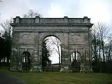 Gascoigne was a strong supporter of the cause of American Independence and built a commemorative arch to the American victory in the War of Independence, at the entrance to his Parlington Hall estate.[12][13] The main frieze read 'Liberty in N. America Triumphant MDCCLXXXIII' and whilst it categorically supported the American cause, the arch also subtly indicated Gascoigne's approval of Rockingham who had vocally opposed both Lord North, and the war, in Parliament.[14] The Parlington arch still stands and in 1975, on the advice of Nikolaus Pevsner, the British Government made unsuccessful enquiries into the possibility of gifting it to the United States of America to mark the bicentenary of American Independence.[15]