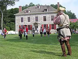 In 1748, Johnson built a new stone house upriver from Mount Johnson, which became known as Fort Johnson.[25] The home was heavily fortified when the next war approached. In 1755, Johnson shifted the primary meeting place for diplomatic councils between the British and the Iroquois from Albany to Fort Johnson.[26] He also bought houses in Schenectady and Albany to stop at on his business trips to New York Town.[27]