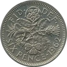 George VI sixpences feature two different reverses, both featuring a crowned Royal Cypher. Those minted prior to 1949 feature a more angular font than those minted later.[24] These later coins do not bear the abbreviation IND IMP, since the king was no longer Emperor of India. The final change in the design of the sixpence came in 1953 when a new reverse was designed for the sixpences of Elizabeth II. These coins feature a floral design by Edgar Fuller and Cecil Thomas on the reverse, consisting of a rose, thistle, shamrock and leek, representing the four Home Nations.[1]