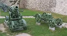 The howitzer with its transport cart; for transport, the barrel would be removed from the body and placed on the cart, at the Belgrade Military Museum, Serbia