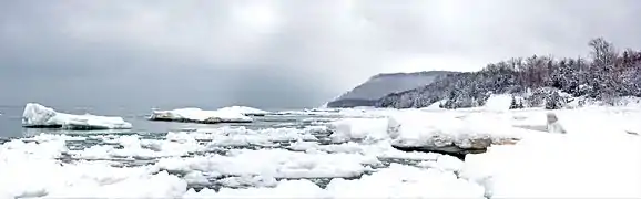 The park is named after an Ojibwe legend of the sleeping bear. According to the legend, an enormous forest fire on the western shore of Lake Michigan drove a mother bear and her two cubs into the lake for shelter, determined to reach the opposite shore. After many miles of swimming, the two cubs lagged behind. When the mother bear reached the shore, she waited on the top of a high bluff. The exhausted cubs drowned in the lake, but the mother bear stayed and waited in hopes that her cubs would finally appear. Impressed by the mother bear's determination and faith, the Great Spirit created two islands (North and South Manitou islands) to commemorate the cubs, and the winds buried the sleeping bear under the sands of the dunes where she waits to this day.[5] The "bear" was a small tree-covered knoll at the top edge of the bluff that, from the water, had the appearance of a sleeping bear. Wind and erosion have caused the "bear" to be greatly reduced in size over the years.