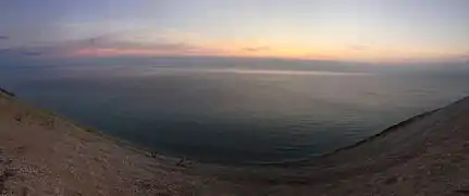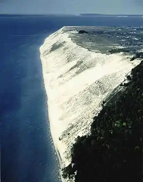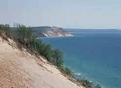 Sleeping Bear Dunes National Lakeshore is a United States National Lakeshore located along the northwest coast of the Lower Peninsula of Michigan in Leelanau and Benzie counties near Empire, Michigan. The park covers a 35-mile-long (56 km) stretch of Lake Michigan's eastern coastline, as well as North and South Manitou islands. This Northern Michigan park was established primarily because of its outstanding natural features, including forests, beaches, dune formations, and ancient glacial phenomena. The lakeshore also contains many cultural features including the 1871 South Manitou Island Lighthouse, three former stations of the Coast Guard (formerly the Life-Saving Service) and an extensive rural historic farm district. In 2011, the area won the title of "The Most Beautiful Place in America" from Good Morning America.[3] In 2014, a section of the park was named the Sleeping Bear Dunes Wilderness by the United States Congress.