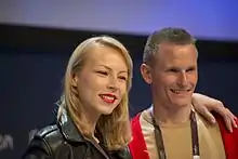 The Slovenian performance featured ManuElla performing in a long white dress, joined by an acrobat on stage who performed spins on a pole.[23][24][25] The stage colours were blue and red and the LED screens displayed images of ManuElla's face miming the lyrics of the song. The performance also featured the use of a wind machine and fountain pyrotechnic effects. The Slovenian performance was choreographed by Anže Škrube.[26] ManuElla was joined by four off-stage backing vocalists: Karin Zemljič, Lea Sirk, Mitja Bobič and the co-composer of "Blue and Red" Marjan Hvala.[26] The acrobat featured during the performance was Jannik Baltzer Hattel from the Danish acrobatic trio No Limits.[26]