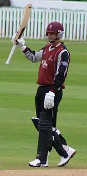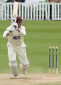 Somerset began their season by playing out a high-scoring draw at home against Warwickshire, in which both teams reached 500 in their first innings. James Hildreth scored a triple-century, reaching the milestone earlier in an English season than any player previously,[55] and became the first English player to pass 300 runs in an innings for Somerset since Harold Gimblett in 1948.[56] In contrast, Somerset had to battle back for a draw in their second match. After Durham scored 543 in their first innings, Somerset collapsed to 69 all out in reply; only Langer passed 20 runs, while six of his batting colleagues made ducks. After being forced to follow-on, Trescothick, Langer and Kieswetter all scored centuries to secure a draw. Somerset's third match resulted in their only loss of the County Championship season,[57] coming against Nottinghamshire at Trent Bridge; and at the end of May, they were second bottom in the first division.[58] Their next match finished in a draw against Lancashire, a result which was always likely after the first day was lost to rain.[59] Somerset next picked up victories against Yorkshire and Sussex before scoring the second-highest ever fourth innings winning total in the County Championship to beat Yorkshire at Taunton.[60] These three wins propelled Somerset to third in the competition at the start of July, and they did not drop below this position for the remainder of the season.[58][61]
