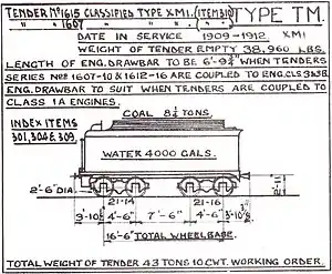 The tender had a coal capacity of 8 long tons 5 hundredweight (8.4 tonnes) and a water capacity of 4,000 imperial gallons (18,200 litres), with a maximum axle load of 10 long tons 18 hundredweight (11,070 kilograms).[2][3]