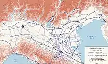 U.S. IV Corps had continued their northwards advance and reached the Po river at San Benedetto on 22 April. The river was crossed the next day, and they advanced north to Verona which they entered on 26 April. To the right of Fifth Army on Eighth Army's left wing, British XIII Corps crossed the Po at Ficarolo on 22 April, while V Corps were crossing the Po by 25 April, heading towards the Venetian Line, a defensive line built behind the line of the river Adige. As Allied forces pushed across the Po, on the left flank the Brazilian, 34th Infantry and 1st Armored Divisions of IV Corps were pushed west and northwest along the line of Highway 9 towards Piacenza and across the Po to seal possible escape routes into Austria and Switzerland via Lake Garda.[23][24] On 27 April, the 1st Armored Division entered Milan, liberated by the partisans on 25 April, and IV Corps commander Crittenberger entered the city on 30 April.[25] Turin was also liberated by partisan forces on 25 April, after five days of clashes, and on 27 April General Günther Meinhold surrendered his 14,000 troops to the partisans in Genoa.[26] To the south of Milan, at Collecchio-Fornovo, the Brazilian Division bottled up the remaining effectives of two German divisions along with the last units of fascist army, taking on 28 April 13,500 prisoners.[27]