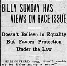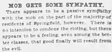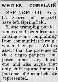 It was noted that "the Negro of Springfield is not the Negro of the South," in that a black man in Springfield had an "aggressive attitude," which he would use to readily argue that he was "just as good as a white man."[2] Corrupt white politicians were said to have contributed to this "arrogant attitude" by giving them city jobs, despite "the majority being lazy, dishonest, vicious, worthless, and genuinely bad."[2] It was reportedly this "attitude" that created a strong dislike against them in among Springfield's white citizens, on par with the dislike of blacks in the South.[2]