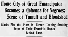 In Springfield, such attitudes were inflamed by white Americans who had immigrated from Kentucky (across the Ohio River), from the border area of southern Illinois, and also from other areas across the south, seeking work in the mines and railroads.[47][48][49] These southern immigrants brought the heightened racial animus with them that was associated with the segregated racial culture of the region.[50][51]