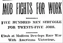 Stories of black strikebreakers were carried by numerous newspapers in Illinois. The disproportionate coverage of these instances fueled white antagonism against the black workers.[58] In 1898, labor violence broke out in what was called the Battle of Virden, resulting in 11 deaths.