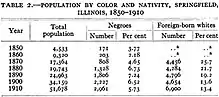 In 1908, Springfield was a transportation hub, connected by railroad to other major cities such as Indianapolis, Louisville, and Kansas City, etc.[8] Illinois is often considered a microcosm of the U.S. and Springfield, with about 45,000 people at the time, most of whom were working class, was described as an "average American community".[9][10][11][12]