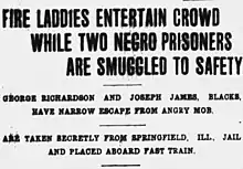 - "TO Try Negroes at Capital". The Decatur Herald. 25 Aug 1908.