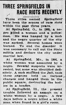 - "Trial Begins: Joe James Negro Who Started Recent Springfield Riots". The Evening Star. Independence, Kansas. 15 Sep 1908.