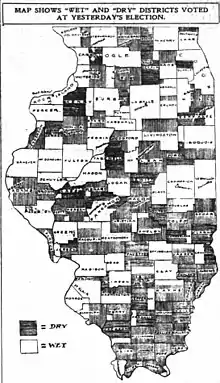 After a highly contentious debate on prohibition, in 1907, the Illinois General Assembly approved the "local option" law, which allowed local residents to decide whether their towns would be "wet" (allowing liquor sales within the boundaries of individual counties and townships), or to otherwise be "dry."[103]