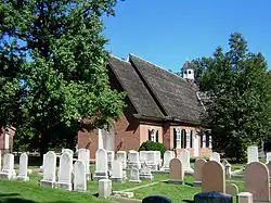 The original building, built in 1743 of salmon red brick, was a 56 x 36 foot (17 x 11m) rectangle. Eight windows with round arch tops lighted the building, four on each of the long walls. These retain much of their original 1743 glass. There were also three similar windows on the short liturgical west wall and a small window near the peak of the roof. (The building sits on an angle, so that liturgical west is actually southwest.) The entrance was in the liturgical south wall. It had a wide, brick paved, center aisle and white box pews, both of which remain.[2]