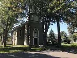 Built in 1858, the church is a stone Gothic Revival-style structure consisting of two gabled limestone sections: a one-story rectangular main block and an attached modern side wing. It features a three-stage tower with a limestone base, a wood midsection, and a domed cupola topped by a round finial and simple cross.[2]